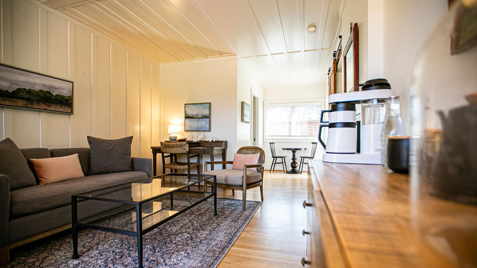 The queen bedroom is simple and serene, while the bath, featuring a walk in shower, adds comfort after a day outdoors. The ‘coffee bar’ is stocked with a Ratio coffee machine, a curated tea selection, and everything you need to start the morning quietly, intentionally.
